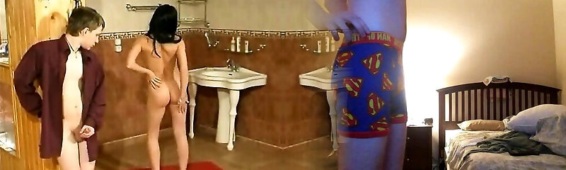 Busty female makes deep Sucky-sucky in the bathroom skinny guy with fat cock...