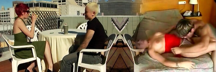 Chubby and wild chicks Jynx Maze and Roxi blow knob on the balcony