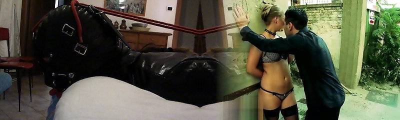 Laura is wearing a sexy white dress, pink pantyhose and platform high-heeled shoes, tied up and gagged in a bed