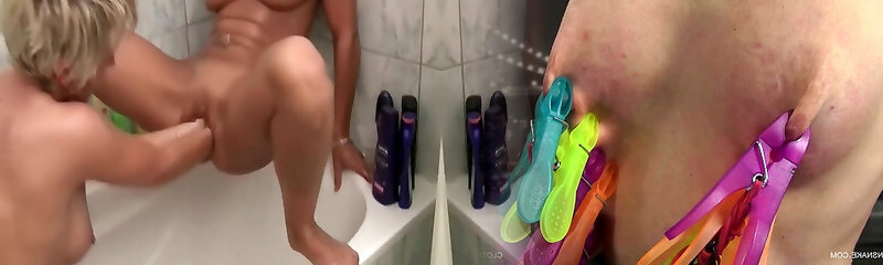 3 Lesbians peeing and going knuckle deep in a tub