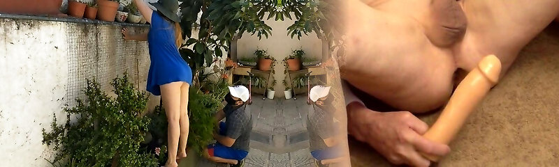 Sex with the voyeur gardener with a girl in a brief sundress without panties