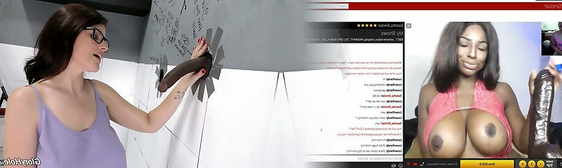 Nerdy brunette in glasses Michele James is probing giant black dick sticking out of the wall