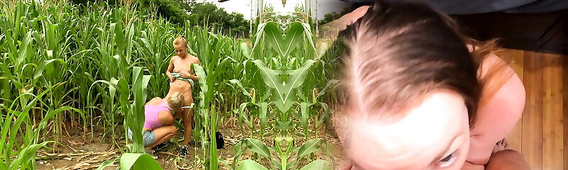 Junge Maedels verstecken sich im hohen Mais um zu spielen