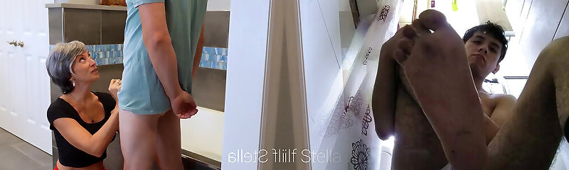Kinky ovulating mommy is spying on her stepson in the shower