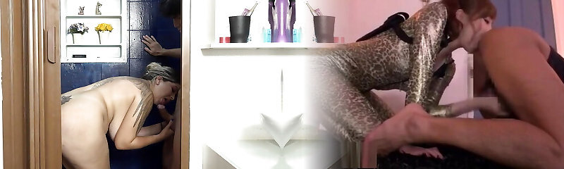 Chubby amateur slut droplets on her knees and sucks lot of stiff dicks