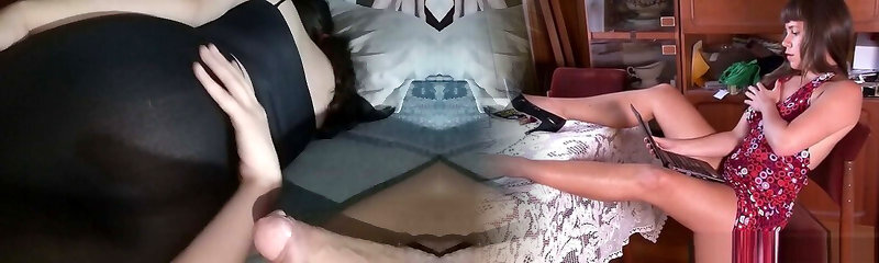 Lady Boss in Nude Tights and High High-heeled Slippers Gives Femdom Handjob on Crossed legs