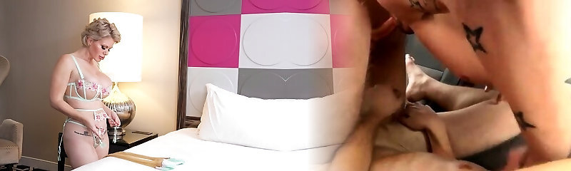 Fellow plows older blonde's shaved pussy in lingerie deep