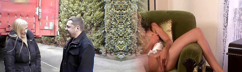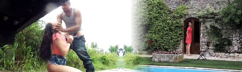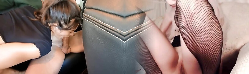 Flamboyant dark-haired babe and 2 rock-solid cocks in the van