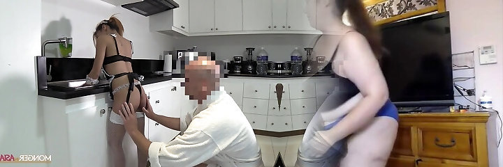 Japanese maid enjoys hardcore threeway