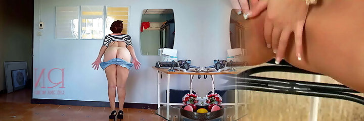 Regina Noir in jeans cut-offs. Home striptease. Housewife shows her pussy.. regina noir