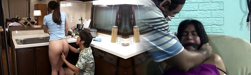 Asian Milf has her skirt lifted and beaver fucked in the kitchen