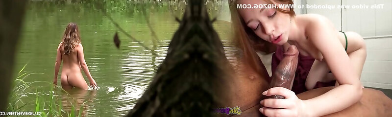 Glorious redhead slender teen babe in the forest lake swimming nude